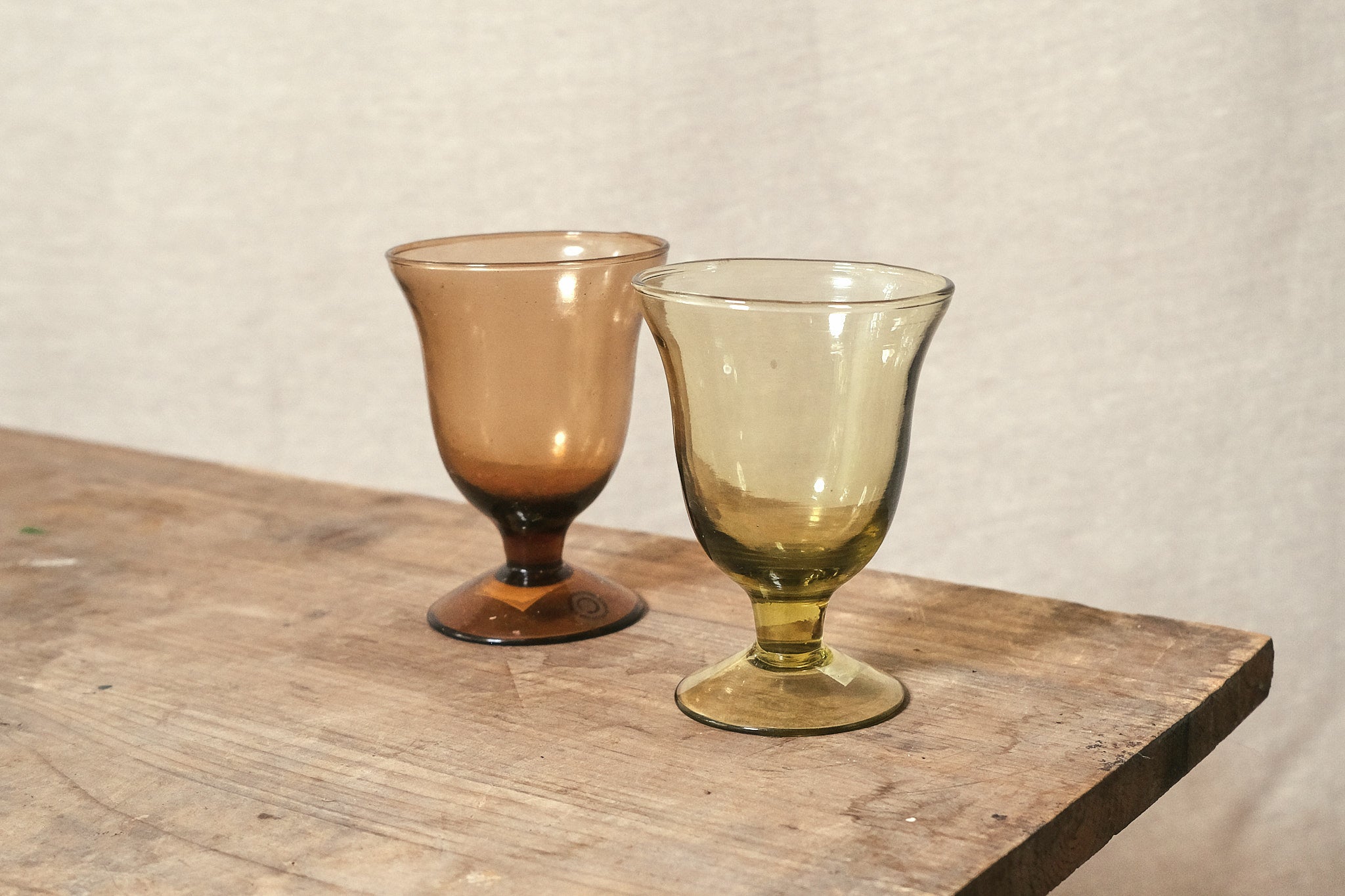 A low and irregular shaped wine glass, with unique curves and flows owed to the hand-blown nature. Made from recycled glass.