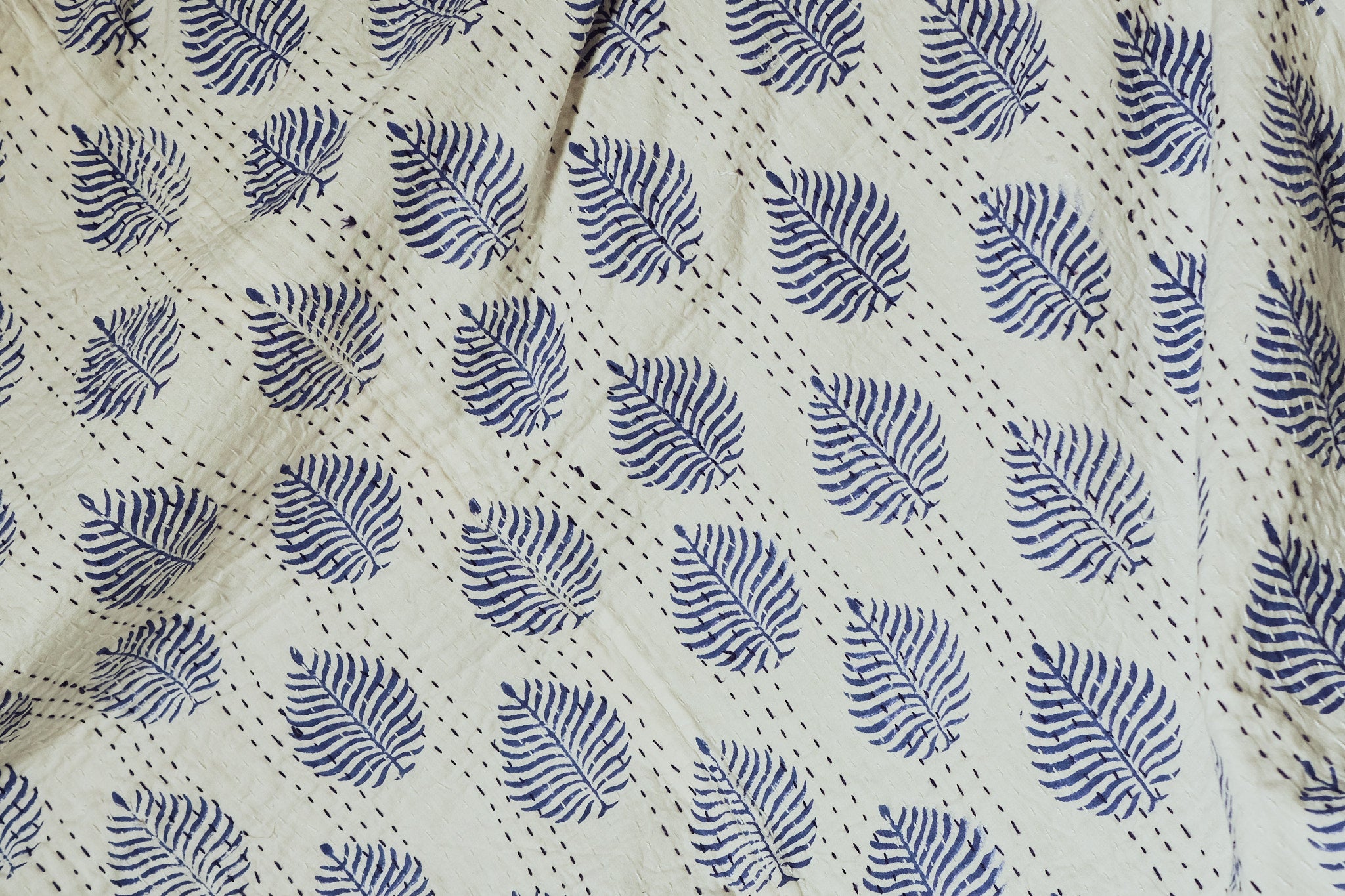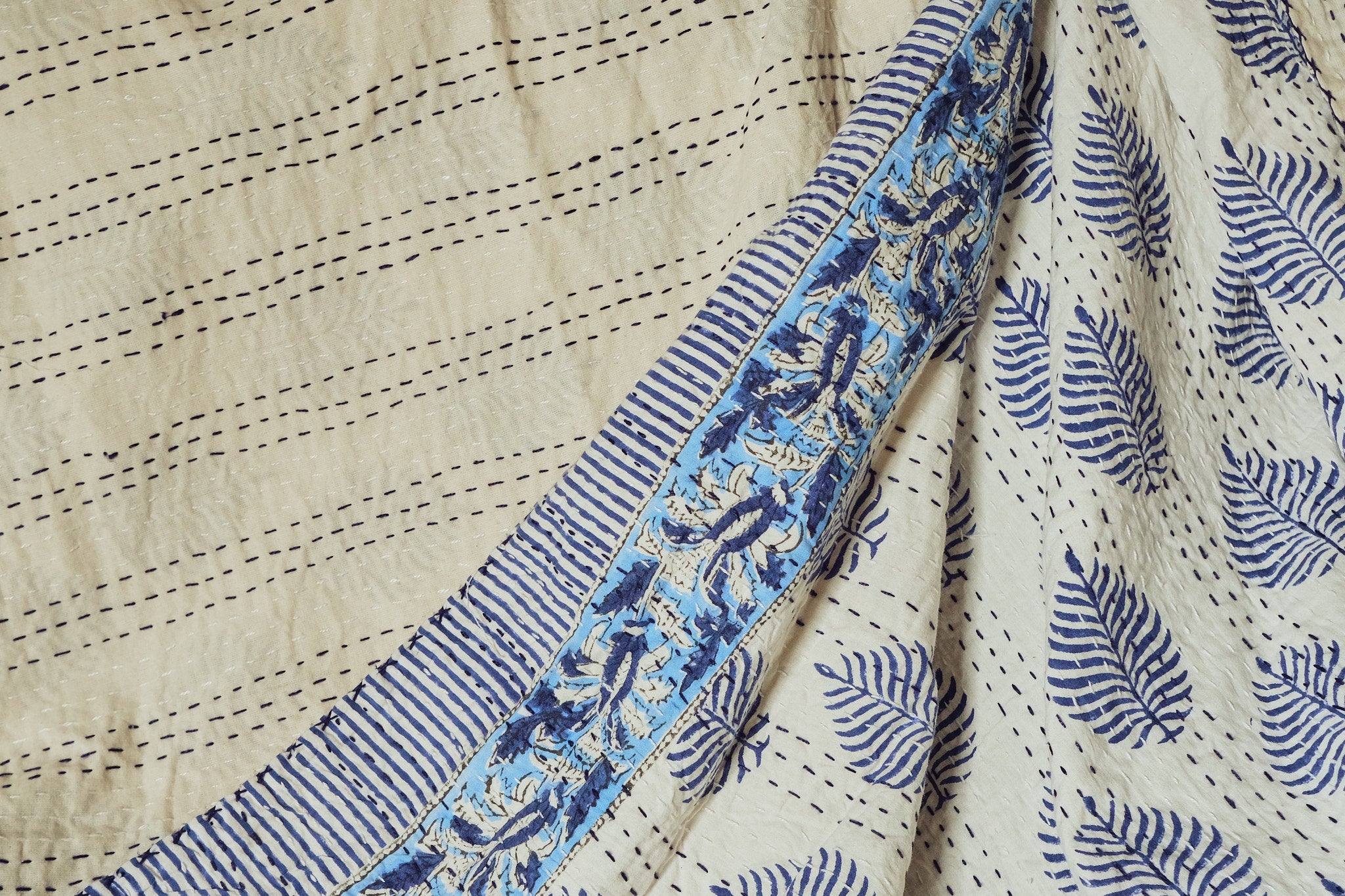 The reverse side is a neutral cotton with blue kantha stitching.