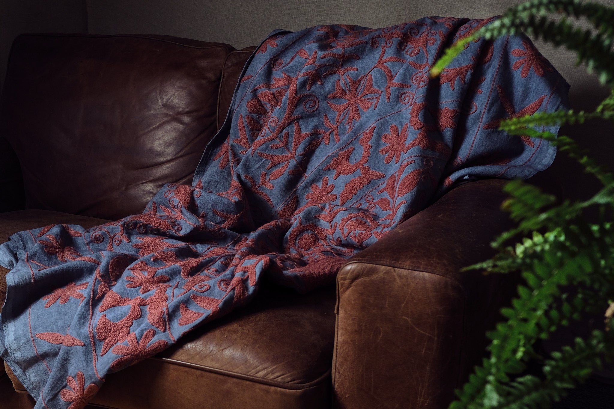 A one of a kind, hand embroidered Suzani throw made from a dusty blue cotton base with brick red woollen embroidery.