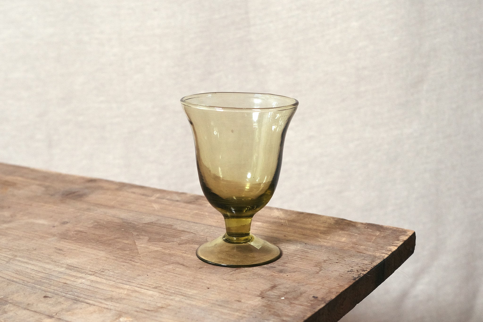 A low and irregular shaped wine glass, with unique curves and flows owed to the hand-blown nature. Made from recycled glass.