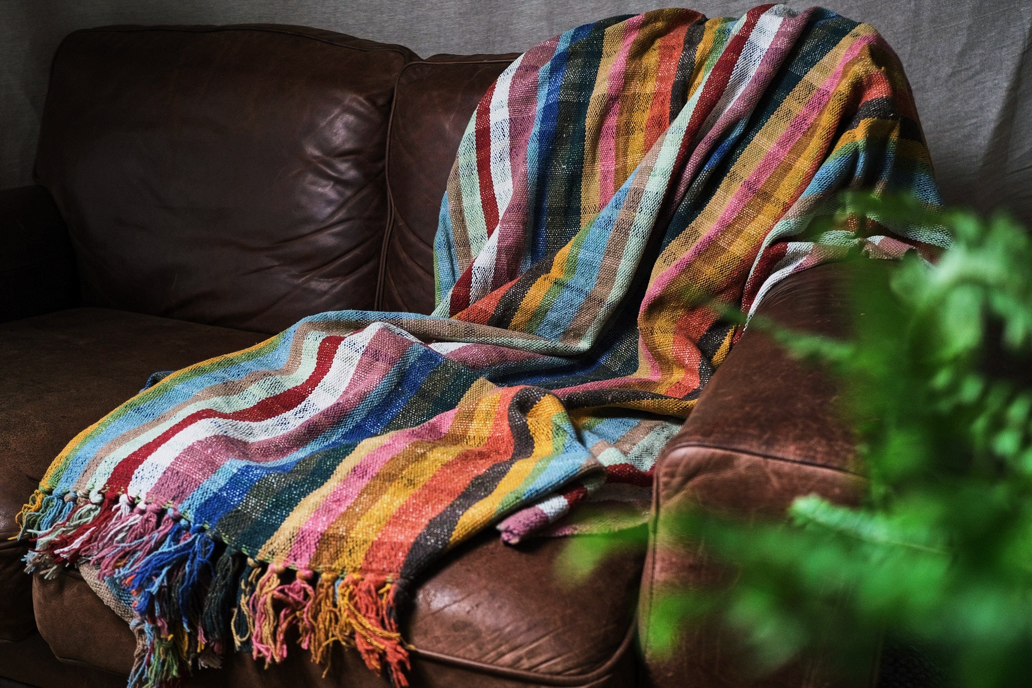 A multicoloured throw, finished with fringing, with stripes of colour and a checked texture pattern running through; Burnt oranges and yellows, pinks, blues and plum. Perfect for cosy evenings on the sofa or to dress the end of the bed. Made predominantly from recycled cotton.