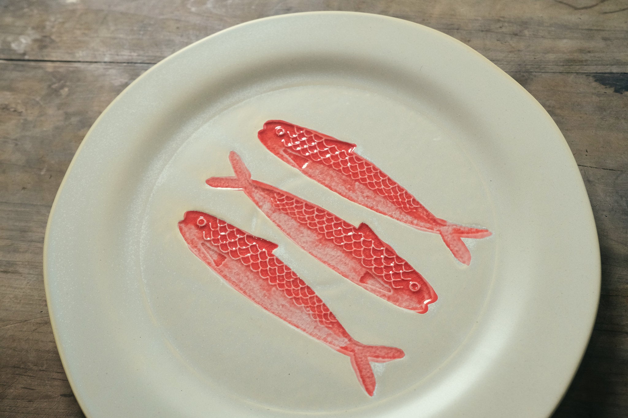 Made from stoneware with a reactive glaze and three painted red fish at the centre. The glazed illustration contrasts beautifully with the matte surface. Variations in the glaze make each piece unique.