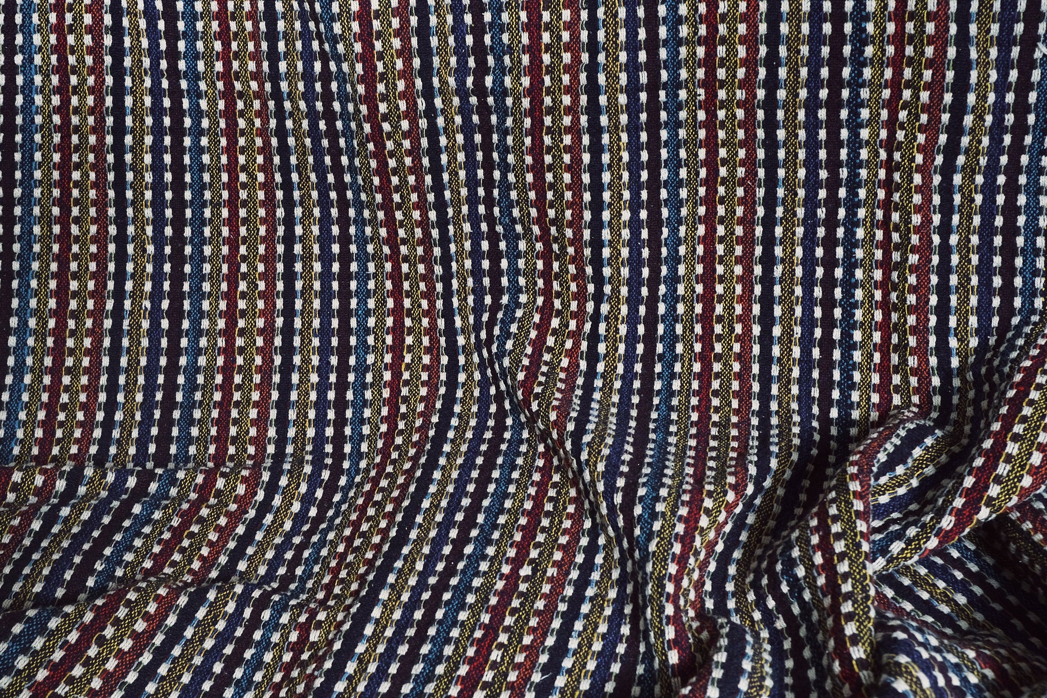 A multicoloured throw, finished with fringing, with an intricate pattern in stripes of colour. Perfectly cosy, made predominantly from recycled cotton.
