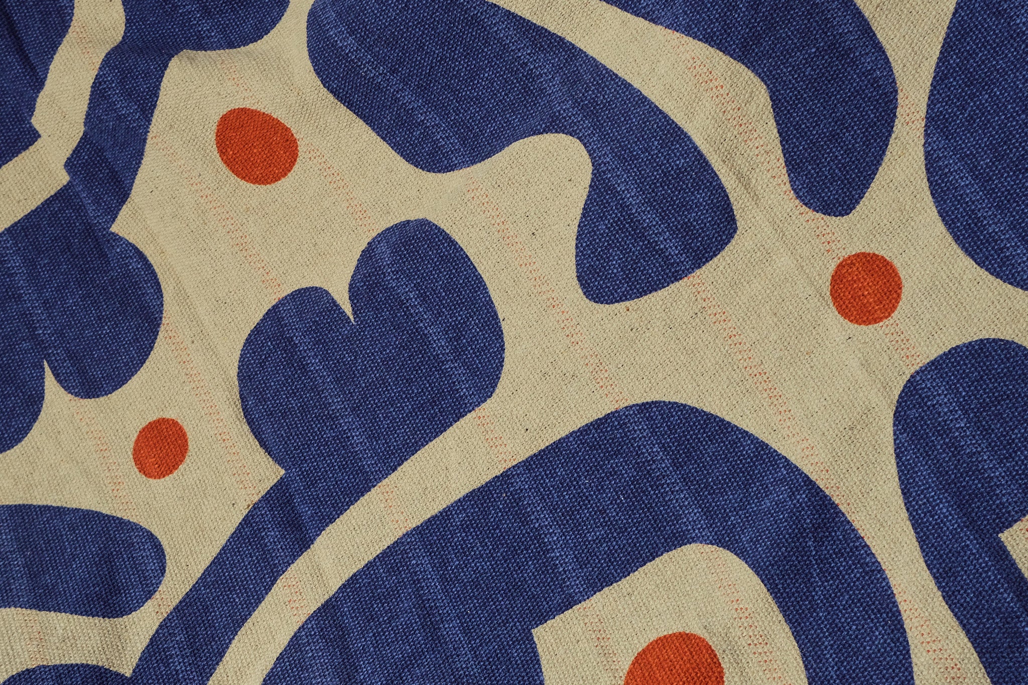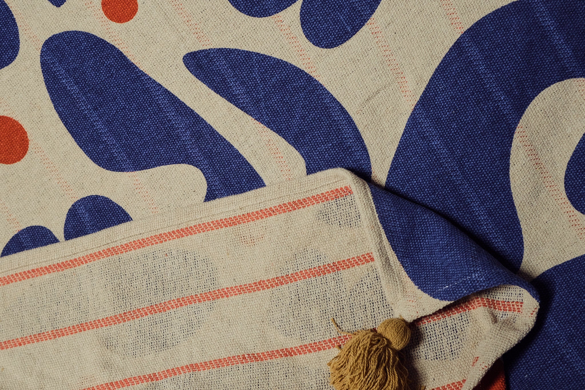 A striking and cosy doubled-sided throw; The front bears an abstract pattern in blue and red against a neutral background, the back with simple red stitched stripes. Each corner has a mustard yellow tassel for a playful feel.