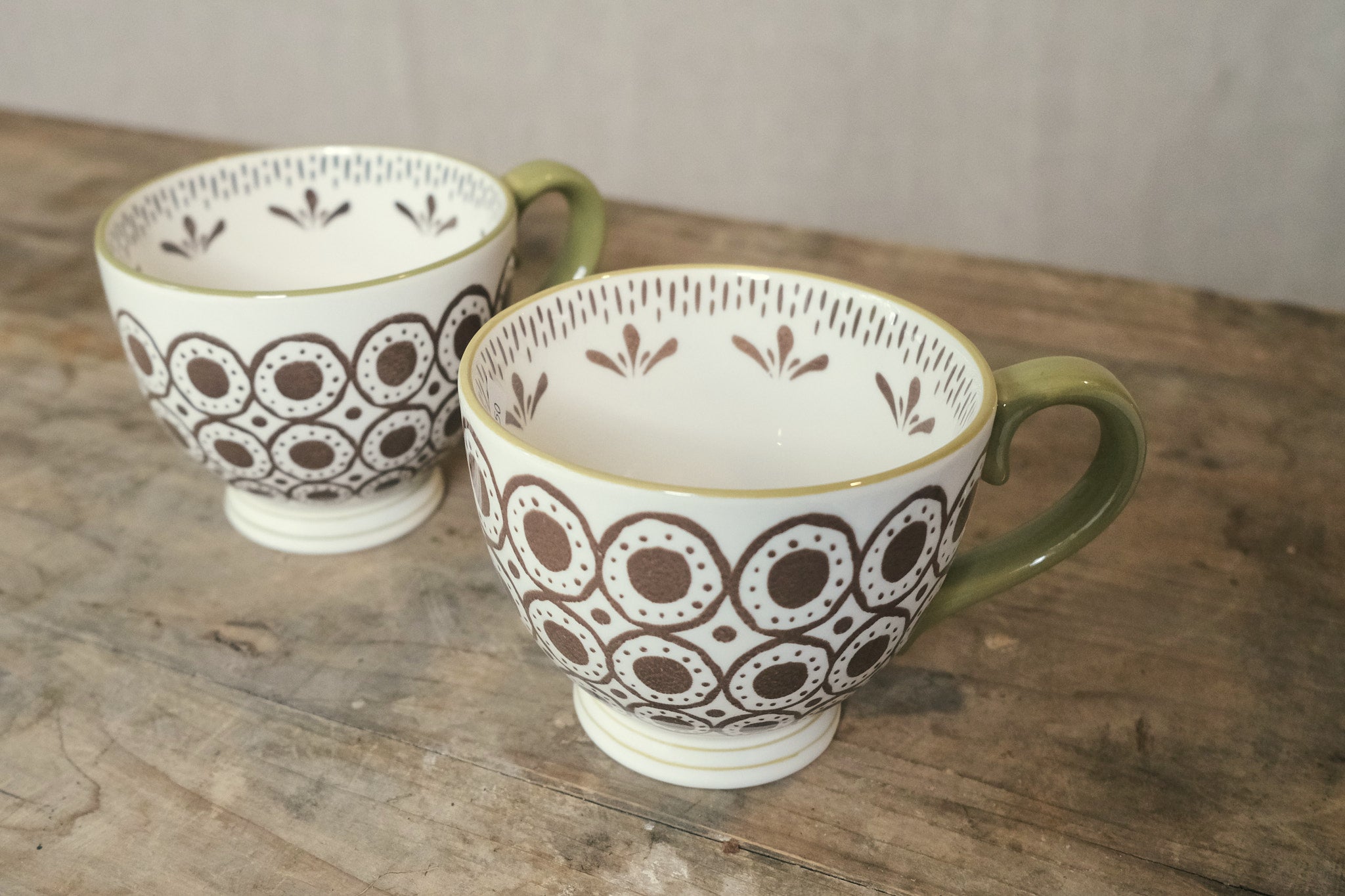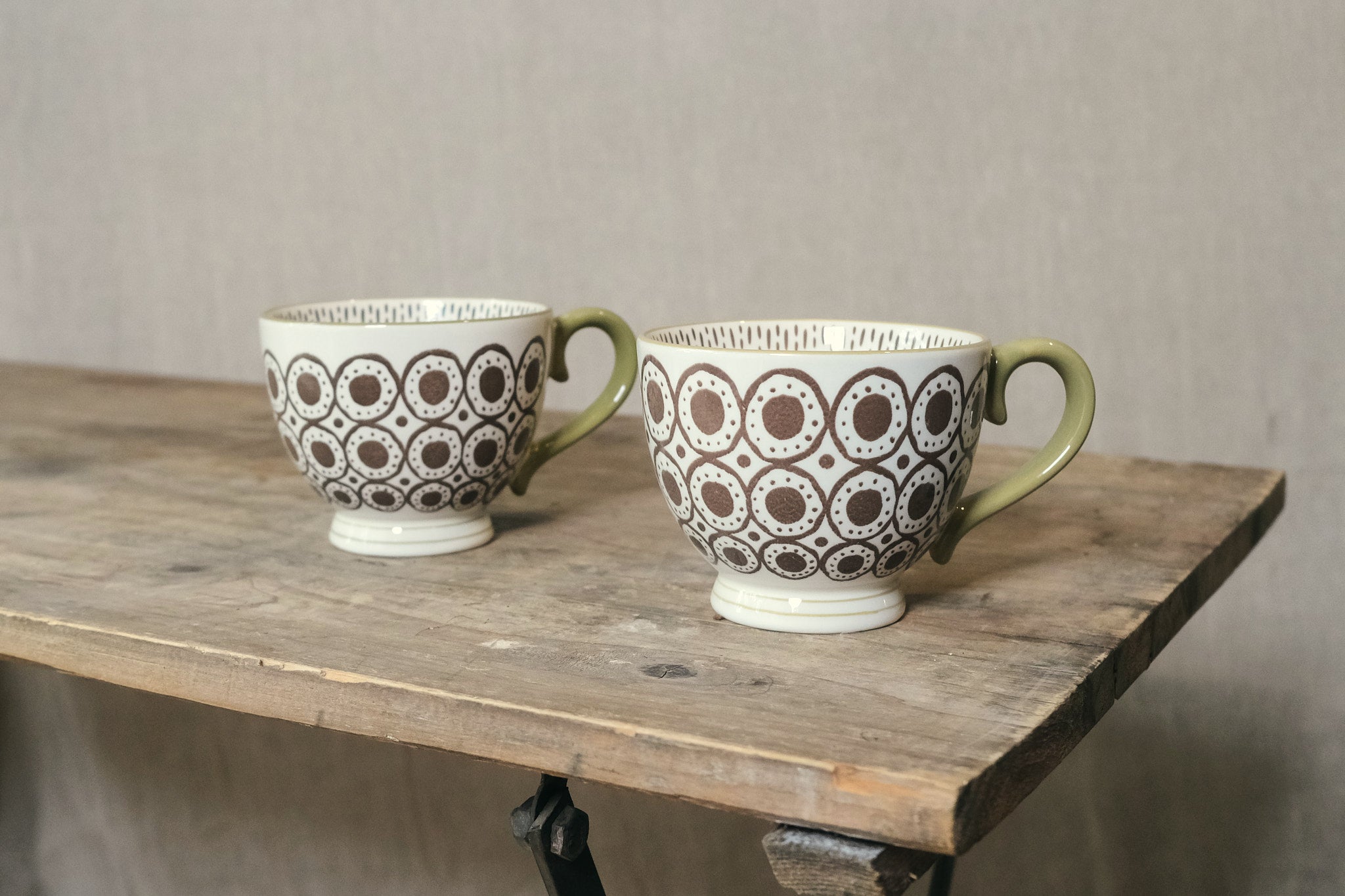 A retro-styled teacup with a brown circle pattern and a decorative green handle. Mix and match with other colours in the range for a 70s feel.